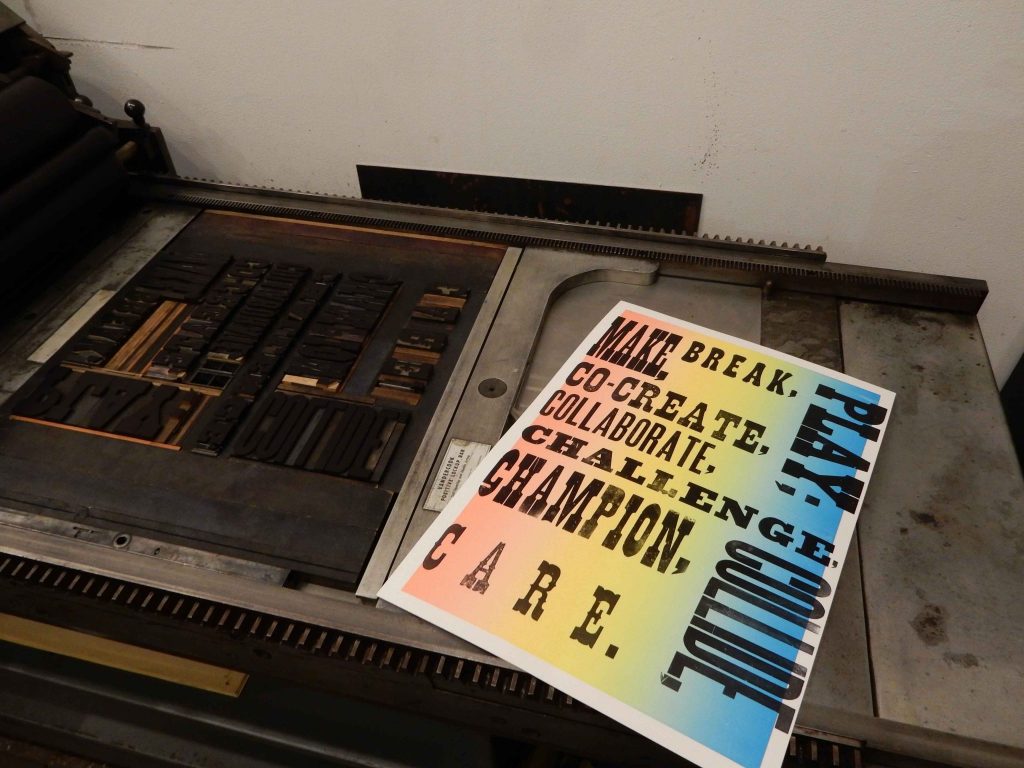 The following night’s blizzard didn’t put a stop to our exclusive Letterpress Workshop in Brooklyn. Alumni had the chance to join staff at The Arm Letterpress Workshop to try their hand at printing some exclusive UAL designs on some of the workshop’s traditional equipment. The catchy quotes were the inspiration of Rebecca Wright (Programme Director and Course Leader of MA Communication Design at CSM), who spoke about her thoughts behind them, as well as some of the developments in the teaching of graphics at the College and UAL.