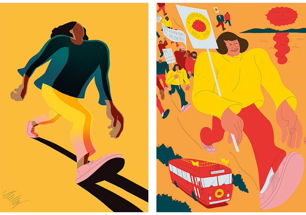 The image on the right is an illustration of Anne Lund, creator for the Smiling Sun, the global face of the anti-nuclear power movement. It was created for Its Nice That, 2018