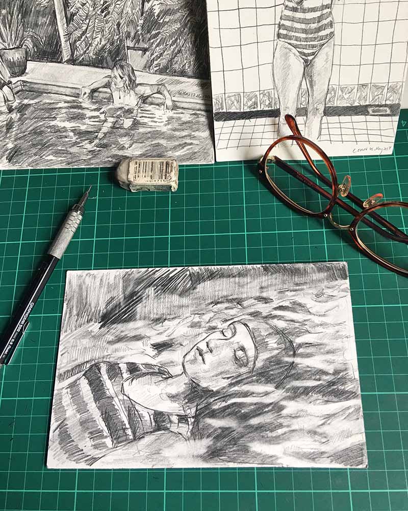 My inspiration was drawn from my first ever night swimming experience on an outlying island of Hong Kong in early 2017. As well as the aforementioned long British nights, which serve as the colour palette for sure. In addition, my MA course research revealed how layers on a painting can depict a certain human physiological state, so I sought to ‘dive in’ and bring the various characters physiological states to the fore.