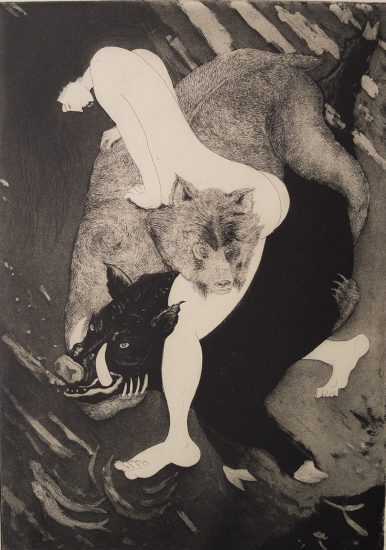 Drawing is at the centre of my practice and is something I try to do it every day. I enjoy the freedom of drawing. On a very small piece of paper, for a tiny price, one can create an imagined scene or draw something beautiful. I love the etching process, for one it’s a good way to turn a drawing into a more solid, fully-realised piece of art. You can also reproduce prints and so this makes them easier to sell at a cheaper price. I like how the image drifts in and out of existence throughout the process of etching; from person to paper to plate to print. Along this process the image evolve as mistakes, accidents and new ideas occur taking the image in new directions.