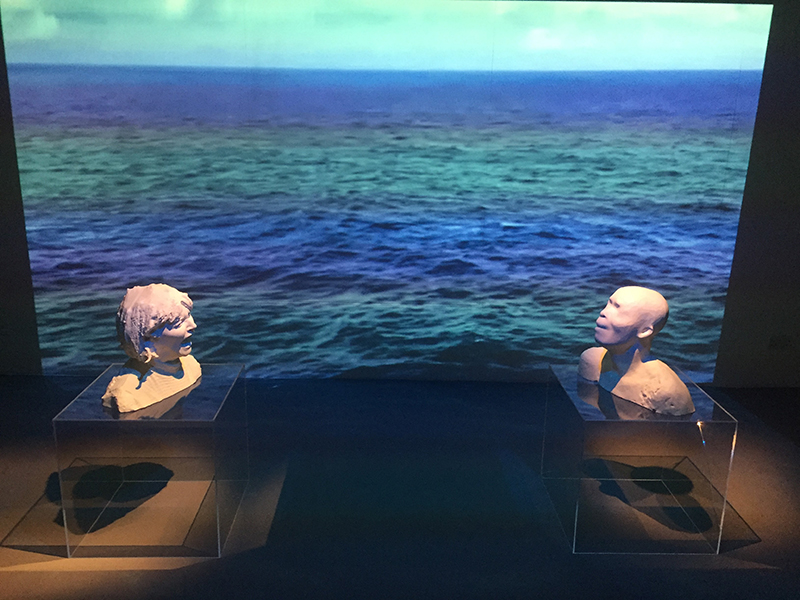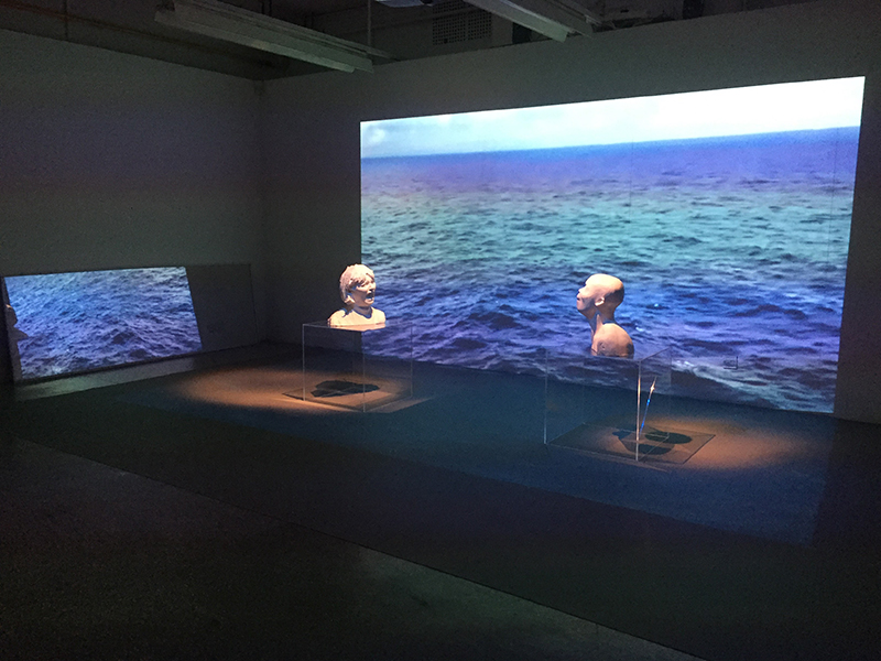 I went about making my final piece with two professional actors who were scanned and then 3D printed at life size scale. The same actors were filmed in a green screen studio in one of Camberwell’s technical resources, with two versions of the short film and a binaural recording produced. I used transparent plinths against projections of the sea on the floor and wall to create the impression to the viewer that the refugee was in the water.