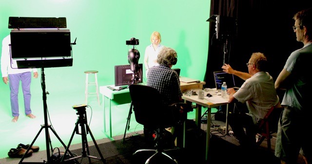 Terence “pointing as producer, director and autocue operator” on set with the film crew and scriptwriter.