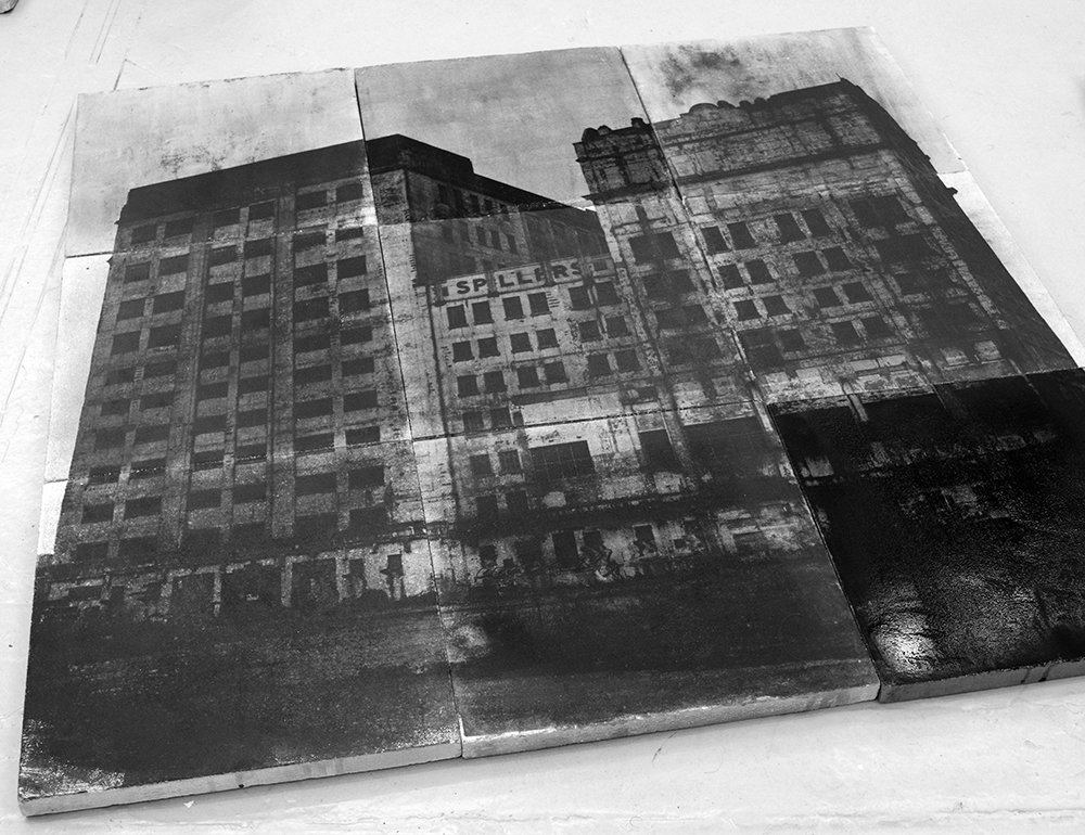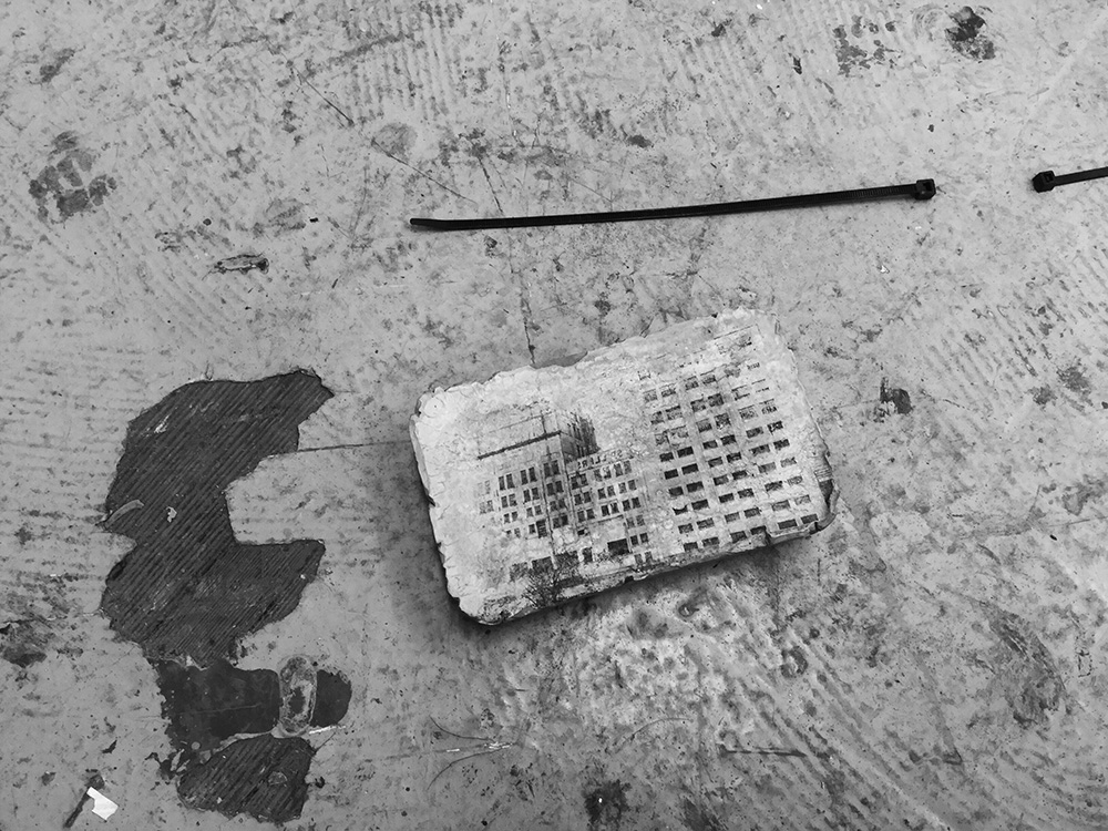 The idea to use concrete as my canvas emerged during the Balfron project, it seems to be a logical decision to work with a material that is the trademark of modernist architecture, specifically common within Brutalist architecture. For the printing I used liquid light (also known as silver gelatin), it is a fluid material that allows you to apply it to most surfaces, and then it becomes light sensitive. As an analogue photographic process, although it might appear difficult, it offers an alternative to convectional printing methods.