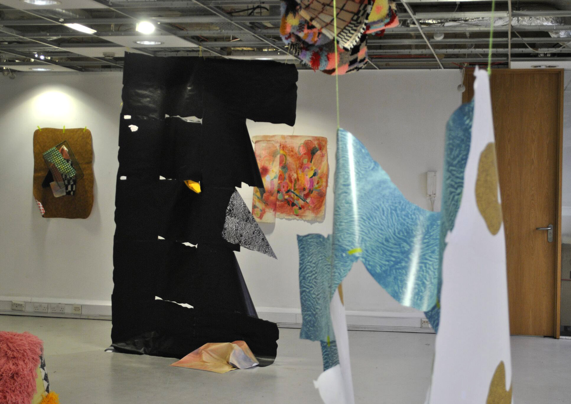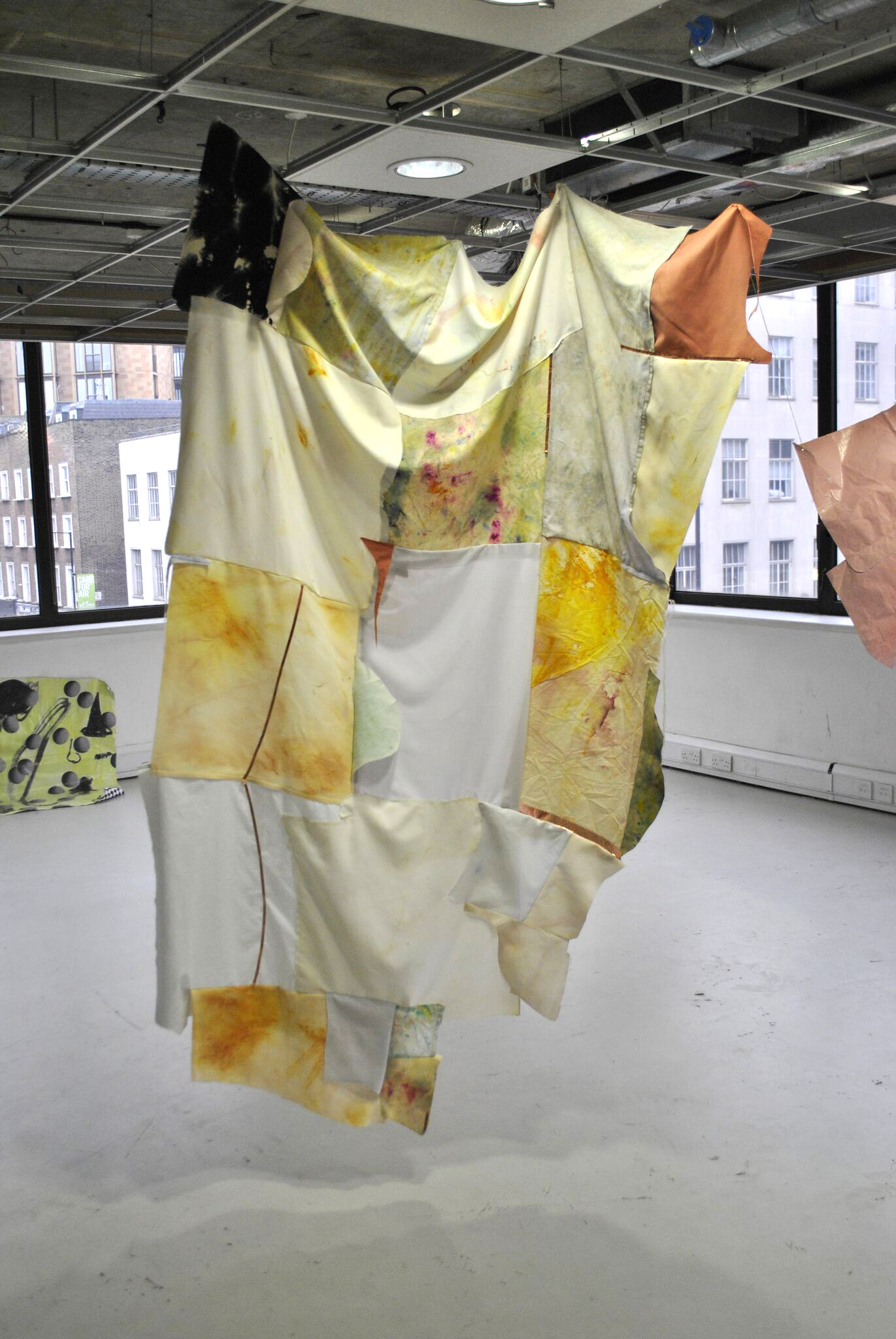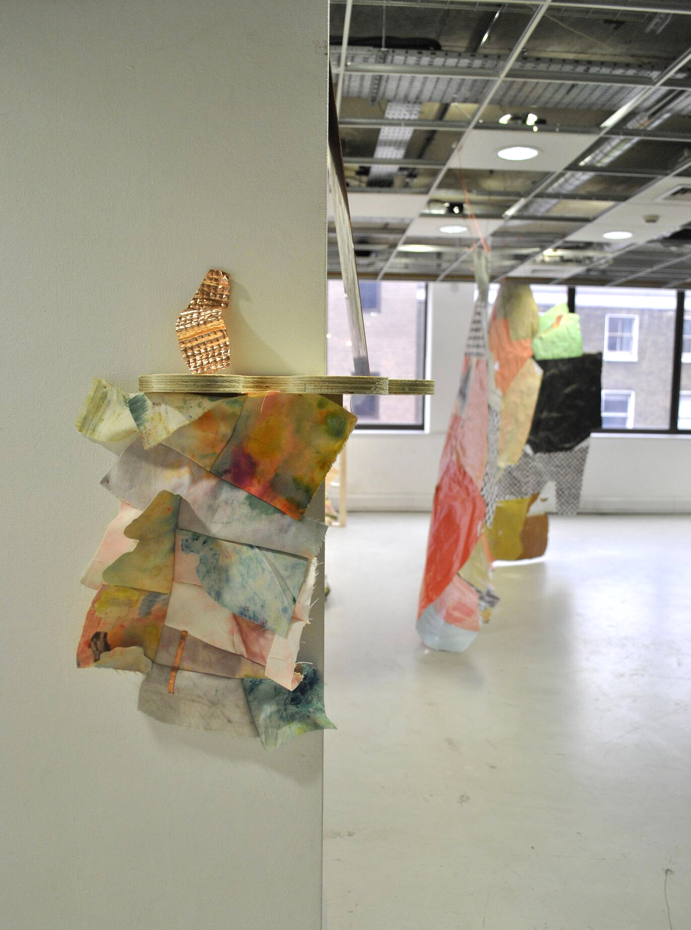 ‘A Casual Texture’ was a collaborative project conducted by Sebastian Thomas and myself, which took the form of a week long residency at Outset Contemporary Art, culminating in an exhibition. Seb and I met on the MAVA Printmaking course, where he was in the year above me. We both work on the fringes of printmaking, using materials, colour and surface to play with print language, often with sculptural or object-based outcomes. In Seb’s MA show I was drawn to a feeling of humour tempered with sadness emanating from the sculptures he had made. We decided to work on something together after a while talking about the emotional resonance of materials. Originally we planned to make work individually and put on an exhibition, but after looking around for a place and not really finding anywhere suitable, we applied to Outset to be part of their residency programme and were delighted to be accepted. When we realised we would have a space to make work in together, we revised our ideas to involve more collaborative work, which was a serendipitous development as I think it really helped me to expand the way I think about making. Seb’s approach is bold, and he definitely encouraged me to be more courageous and experiment with making larger works, whilst still retaining the smaller, softer details and intricacy of making that I like to use. The exhibition contrasted very large suspended collages and textiles hung to form ghostly sculptures with smaller assemblages and paintings. It was an intense period of making work, and I think it provided both of us with a jolt of energy to develop our work outside of our individual practices. Hopefully it will lead to more collaborative work in the future!