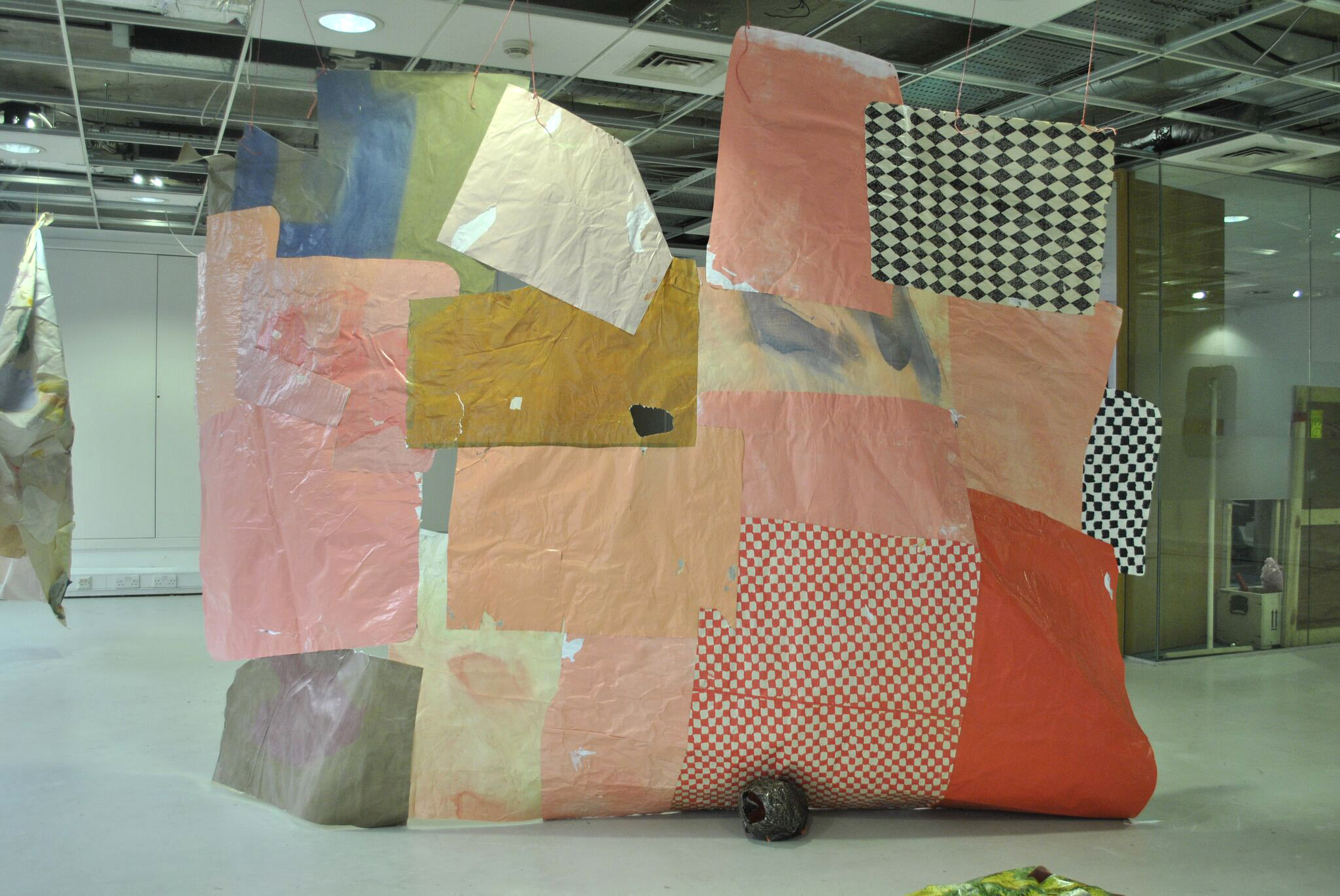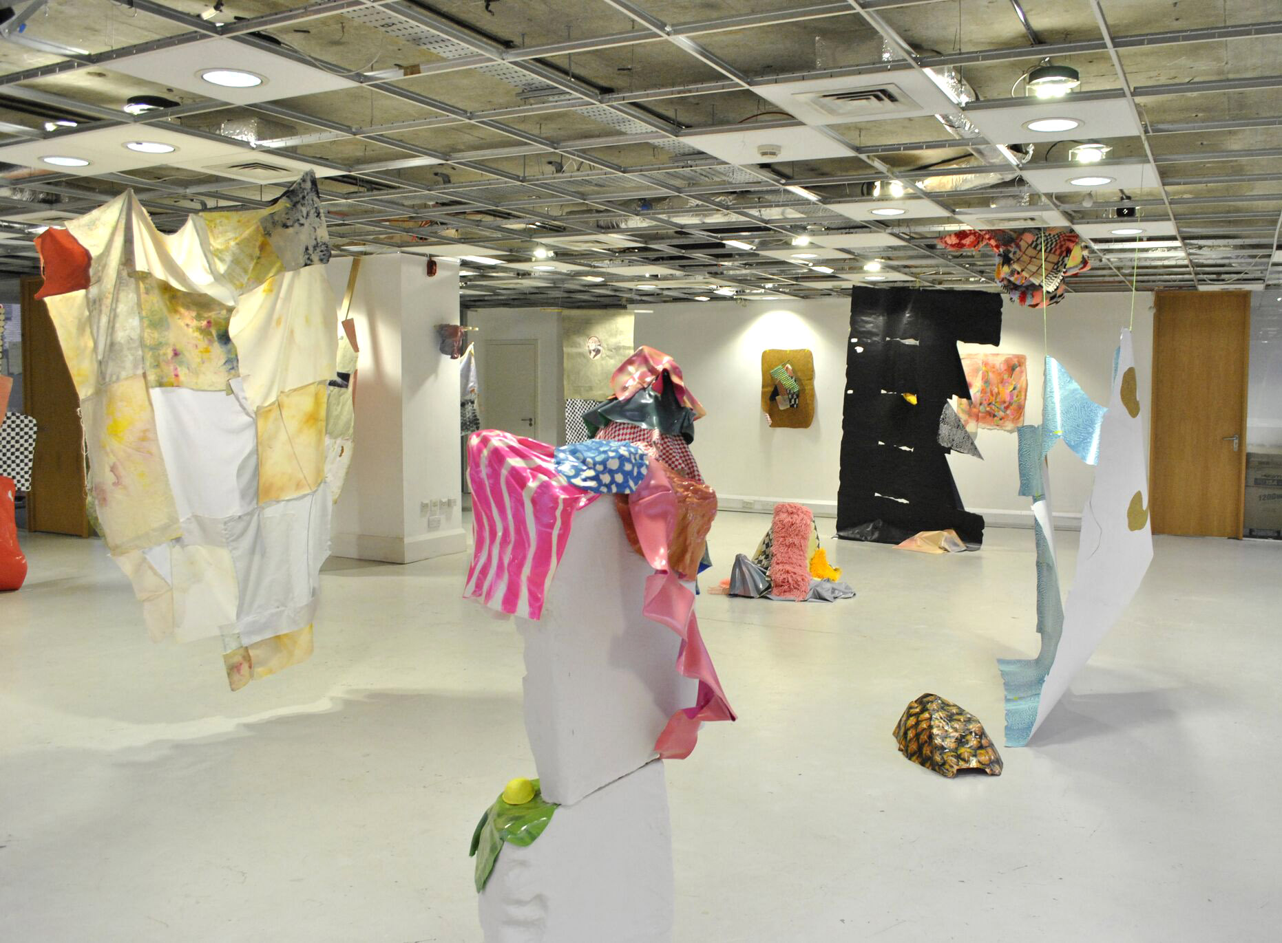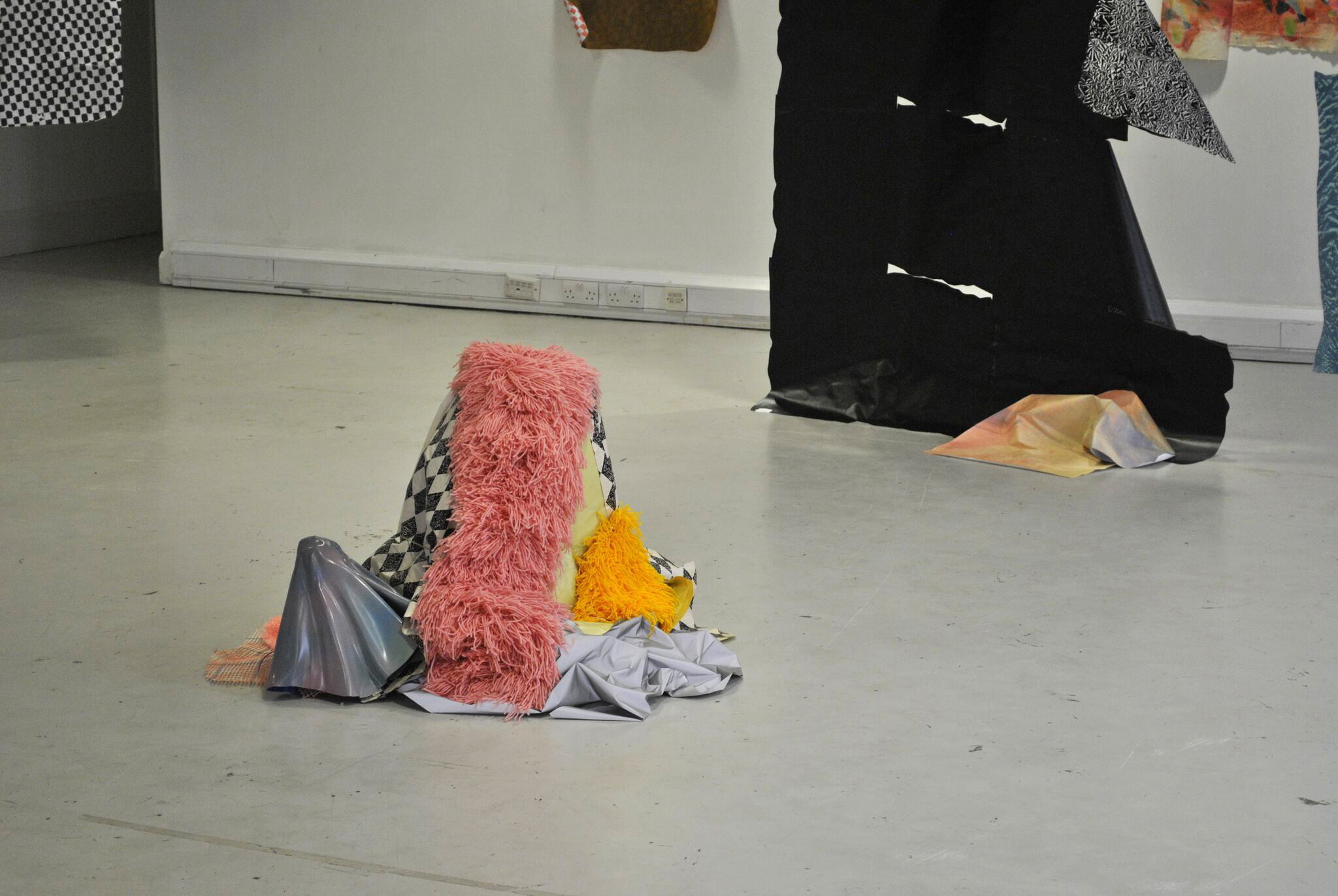 ‘A Casual Texture’ was a collaborative project conducted by Sebastian Thomas and myself, which took the form of a week long residency at Outset Contemporary Art, culminating in an exhibition. Seb and I met on the MAVA Printmaking course, where he was in the year above me. We both work on the fringes of printmaking, using materials, colour and surface to play with print language, often with sculptural or object-based outcomes. In Seb’s MA show I was drawn to a feeling of humour tempered with sadness emanating from the sculptures he had made. We decided to work on something together after a while talking about the emotional resonance of materials. Originally we planned to make work individually and put on an exhibition, but after looking around for a place and not really finding anywhere suitable, we applied to Outset to be part of their residency programme and were delighted to be accepted. When we realised we would have a space to make work in together, we revised our ideas to involve more collaborative work, which was a serendipitous development as I think it really helped me to expand the way I think about making. Seb’s approach is bold, and he definitely encouraged me to be more courageous and experiment with making larger works, whilst still retaining the smaller, softer details and intricacy of making that I like to use. The exhibition contrasted very large suspended collages and textiles hung to form ghostly sculptures with smaller assemblages and paintings. It was an intense period of making work, and I think it provided both of us with a jolt of energy to develop our work outside of our individual practices. Hopefully it will lead to more collaborative work in the future!