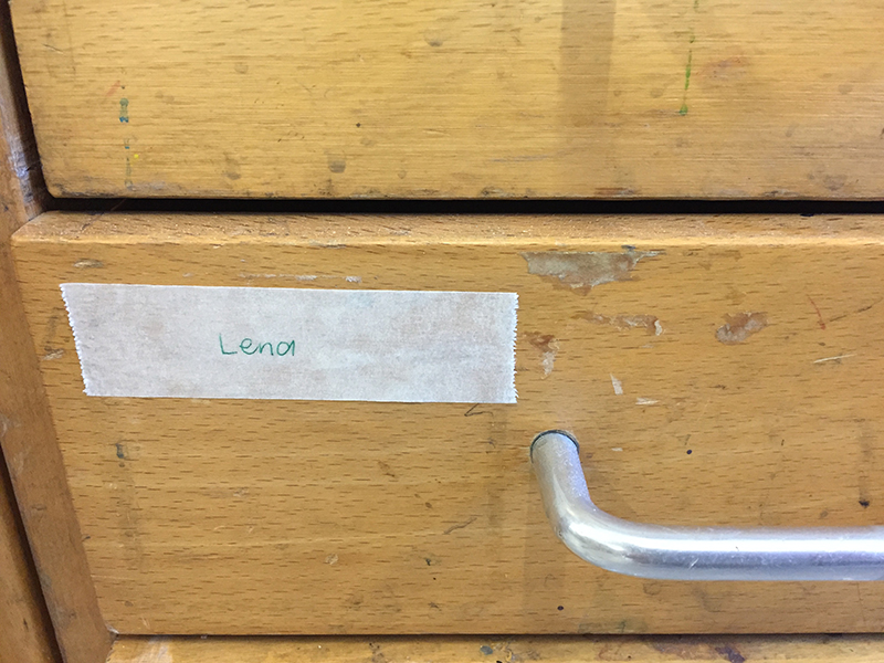 First, I sit with them. There are many of them and they live on 11 shelves behind glass doors. Sitting within the archive seems important, the cupboard doors open, facing the furniture. I am offered a stool by Ira. Sometimes I’m in the way of people moving through the workshop space. When the space was furnished, they didn’t accommodate for an additional body next to the cabinet. If I became part of the furniture I might not block the way anymore. Quickly I have created myself a first comfort zone.
