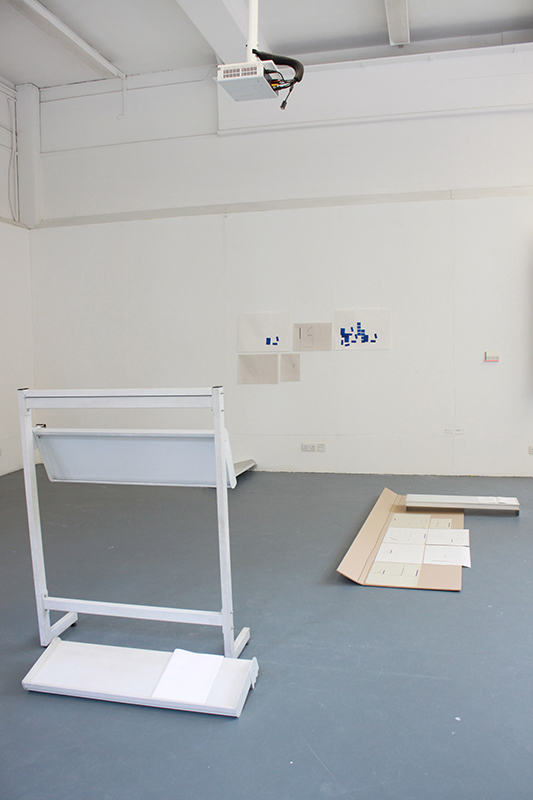 ‘(all of which are in your pouch)’, my summer show piece, connects these experiments in space with ideas of distribution. It is the culmination of a series of installations around my Cantilibra library shelf. The process of installing is mirrored in the presentation the audience experiences. Different elements, such as prints, texts and objects form a space; we relate to the shapes of the space and respond to it. This shows through our immediate behaviour. All of the exhibited elements could exist separately, but also in a group, they can add to a space or form a new one. They are flexible. In the everyday spaces we move through we come across characters that also shape the space. ‘(all of which are in your pouch)’ is a landscape of characters and shapes constructed for the audience to move through and to become aware of.