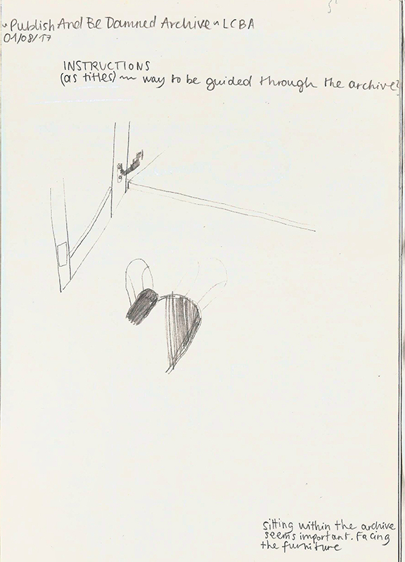 So I’m a resident of the space of LCBA now, and I will react to its inhabitants, the publications, like one would react to a group of people. They gave me suggestions and I reacted to them by adding my own writing. I also make photocopies to keep a record of how the writing I include in my texts was originally laid out. Simultaneously the copies are material to add to the sketches I have been drawing when sitting in front of the cabinet. What I collect from different publications is the space I accumulate, the navigation signs for my walk through the archive.