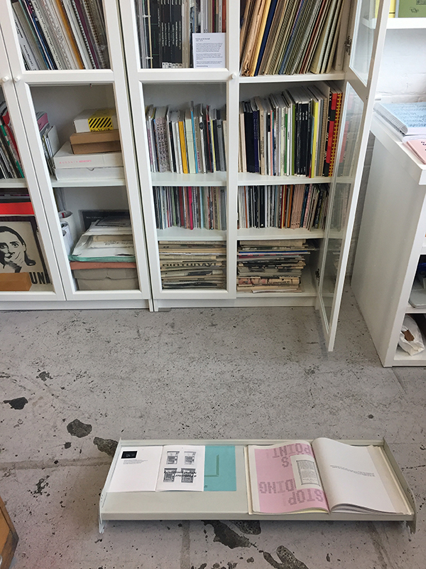 I think the real inhabitants of LCBA are the presses and tools and the furniture. There is furniture in the little bookshop, furniture full of cases holding the fonts and furniture elements in the letterpress workshop, furniture with incorporated drawers and shelves for the bookbinding equipment, furniture in the kitchen, and there is the cabinet hosting publications that have moved in as LCBA’s subtenants. The publications have something in common, they have been donated by publishers attending the Publish And Be Damned (PABD) independent publishing fairs (2004-2013). Now they are in the custody of Three Letter Words, an organization which uses forms of distribution outside of gallery spaces to engage the public. I’m more like an AirBnB guest than a subtenant, but the publications are a little bit like me after all. So I’ll work with them.