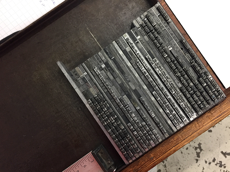 I continue learning to set type in the traditional way. Next to building images from the interlocking furniture I choose parts of the texts I’ve written and set them in Grot and Plantin fonts. Plantin font mostly reminds me of my visit to the Plantin-Moretus-Museum in Antwerp and how inspiring the harbour city was thinking of distribution and advance. I still lay out some lines only as I set the type, but I notice myself getting quicker at measuring the lines and using the right gaps between words. The point and pica ruler in one, tweezers in the other hand, both slowly getting grey from the metal type, the process still has a lot to do with building: paragraphs move apart by inserting spacing material and the three-dimensional construction of furniture and type on the bed of the press has to function on the two-dimensional print held by sheets of paper.