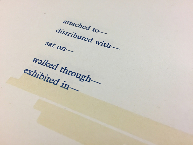 At the moment Three Letter Words is in the process of digitising the PABD archive which increases my interest in working with the publications. Three Letter Words aim is for the archive to be freely accessible to everyone. It makes me wonder how this archive could be connected to other platforms, so that people are aware of their access. How can everyone, literally everyone, be presented with the possibility of accessing? Who is the audience? During my time on the MA my work developed into site-specific installations. I combine prints, books, objects and texts. In the past two years a key process for me was traditional letterpress printing. Its use today emphasizes how printing enabled the start of distributing news and ideas. I combined letterpress printing with the arrangement of geometrical shapes that respond to architectural structures. It led to experimenting with how writing can be installed in spaces alongside objects, my own writing being a mixture of found text and narratives developed in the space I work in.
