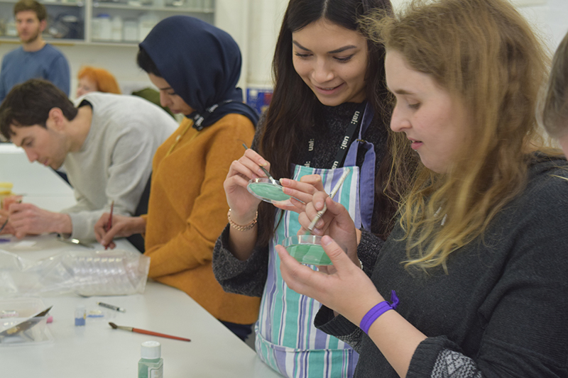 The workshops ran across three days and started with minerals pigments. Day two explored pigments originating from plants and animals and on the final day they studied pigments made of metal. Students experimented mixing, grinding and painting with the dyes, the practical sessions taught them how to prepare pigments and make paints using different traditional recipes. The workshop was taught by subject specialist Cheryl Porter who guided students to recreate the colours used by artists throughout the medieval era. Cheryl is a Camberwell alumna, Director of Montefiasco Project, Deputy Director of Thesaurus Islamicus Foundation & Dar al-Kutub Manuscript Project, and freelance conservator.