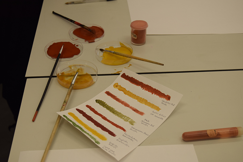 “On the 31st January Cheryl Porter came to the MA Conservation studio to give a three day workshop on pigments used in the Medieval era. We looked at the historic background to the pigments from their trade and production, to the application and also their physical and chemical properties. For each group of colours we also made samples and tried them with different binders such as gum arabic, egg yolk and egg white.