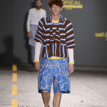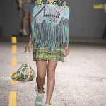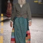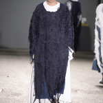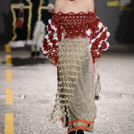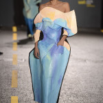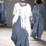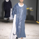 To Anne Smith, Dean of Academic Programmes, the collections were marked by a surface interest in materials and in the variety of finishes. She emphasised that many of the fabrics are hand crafted, and not products of technology. Among examples I noticed are the following: Quoi Alexander’s (Womenswear) monumental broad- shouldered ensemble which has an almost baroque splendour to the weaving, boasting a complex design of laterally threaded coloured ribbons and cottons; Kiko Kostadinov’s (Fashion Design with Marketing) (Dr Martens Bursary) white coat for his blue trousered piece is of gossamer fine material, loosely woven and suggesting a swansdown finish and Tracey Lewis’s (Knitwear) folkloric outfits modelled by men that combined a mix of fabrics with bi-gender design.