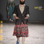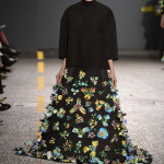 Some trends emerged in the 40 collections. There’s an across- gender emphasis on the following: broad, rounded and padded shoulder lines and cropped sleeves, a core shape that is elongated and slim, waistlines gently indicated or by passed. For the female gender the enormous skirt held up strongly. One such (Daisy Collingridge- Womenswear) is in vibrant yellows, the top skirt with a dancing wavy hemline and multi underskirts in the key colour of varying lengths. Another of its kind, a mega scale piece in black (Amie Robinson-Print) has a surface that offers a virtual garden of three dimensional, solid, larger-than-life flowers.