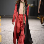 For men: divided skirts cut to just below the knee in snazzy materials (Paulina Edvall- Knit), top coats in interesting colours such as midnight blue (Eleanor McDonald-Menswear) and classic tailored coats to the ankle such as the model in scarlet with matching flares (Ed Lee-Menswear . Gender neutral details: gold lame and silver lame, enveloping wraps in exotic materials, long fringes on fabric, white pants laced in black, black combined with pale grey-were also in evidence.