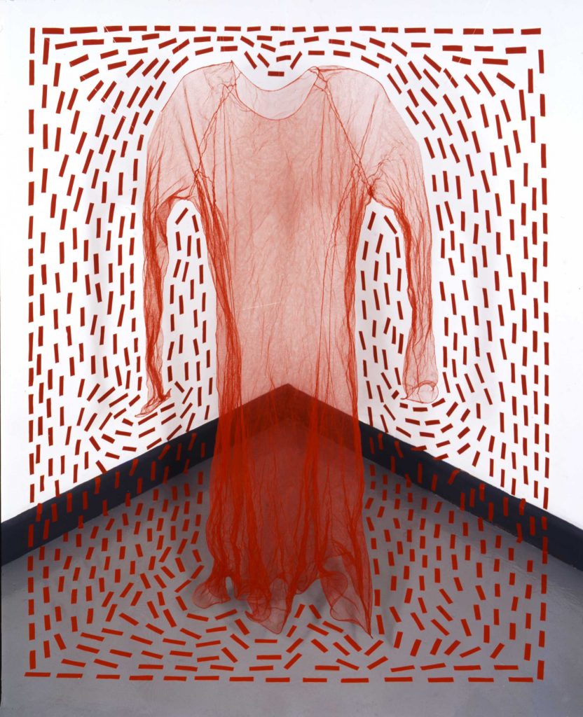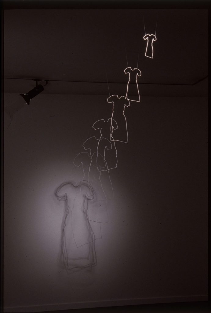 I was exploring a privileged point of view. From most positions the view is a three dimensional one with a sense of space but the view from one specific position offers the illusion of the lines suddenly forming a flattened frame around the dress.