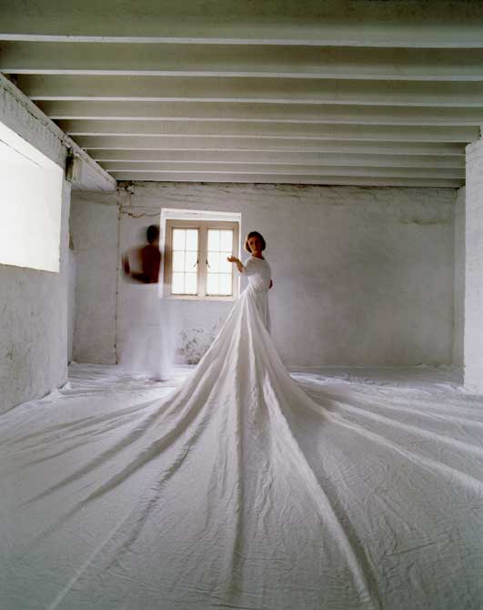 The Waiting Game was a promenade performance in the small garrison of Upnor Castle, on the River Medway, Kent, which played a part in the Dutch Raid in 1667. The white dress was inspired by the idea of an unrecorded female presence; women who had to work there quietly, tethered to the building. The audience came down the steps into the room and had to tread on the dancer’s dress, which allowed her to move in a particular way, to pull away. The audience acted as both an anchor and invader and as such became an integral part of the dance. The idea of trespassing on the dancer’s dress was to offer a personally felt experience, which could lead to a recognition of how larger and more dangerous conflicts arise.