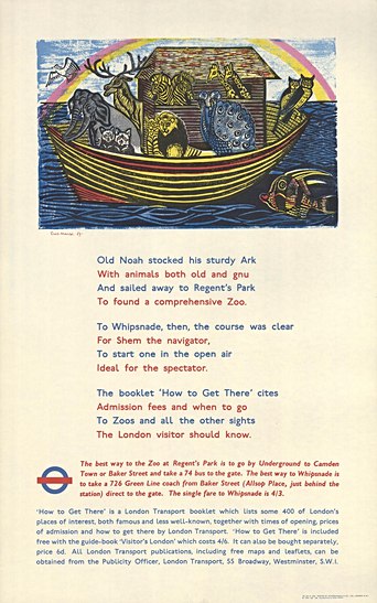 Zoo Poster was one of many designs Marx created for London Transport. It advertises the nearby attraction of London Zoo and the safari park further afield in Whipsnade, through a colourful illustration of Noah’s Ark. The poster was produced in conjunction with a booklet about things to do in London and nearby. Although most people are familiar with the idea of Noah’s ark, carrying pairs of animals to safety during the Genesis flood, not so many will know the story of Shem, Noah’s son, who navigated the ship through the waters. Marx’s use of more obscure biblical names and the unlikely animal representative of a gnu, all used to advertise the London underground, shows the diversity and humour she employed in designing for the transport network.