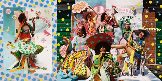 Vibrant and electric Alisa Ruzavina, a 24-year-old print student from Russia has just showcased her joyful and crazy collection Love Bomb for the world to see. A strong believer in creating fashion with a purpose, the designer has finished each of the five looks with an individual message: “No Planet B”, “Stay Humane”, “The Sun Will Always Rise”, “Joyful Riot” “Refuse To Be Confused” and “Love Revolution”. The collection is fully sustainable in accordance with her messages, using organic hemp, cotton and bamboo silk as well as discarded toy waste for embroidery. Sponsored by the Italian company Alcantara, every look is hand-dyed and screen-printed with sponsored eco-friendly Permaset Aqua inks. Repurposing clothing as a tool for positive social change, her collection resists the use of fashion of as a means of oppression.