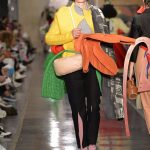 However, amongst the promise of warmer days is the interruption of protruding orbs and mechanical fittings plucked from the large-scale abstract stabiles of American artist Alexander Calder – he himself an immigrant when moving to Paris in the late 1920s. Soft fabrics are juxtaposed with metal contraptions: a ribbon fastening is interrupted by what resembles the steel girders of a railway bridge and a model carries a piece of fibreboard shaped like a deconstructed whale. A pair of trousers is composed of two symmetrical cotton-covered cardboard shapes which flap unhurriedly backwards and forwards like the wings of a tiring bird as the model walks. A cropped blazer is modelled on one which belonged to her great-grandmother some 100 years ago, which buttons beneath a bulging sphere made of rigid milliner’s canvas, sliced into cross sections.
