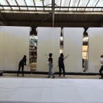 We started by discussing the set, looking at Gary’s mock up set designs and the designs from Roksanda, which was exciting. We then got to work making our own cream coloured primer in huge pots, which we then painted onto the huge canvases.