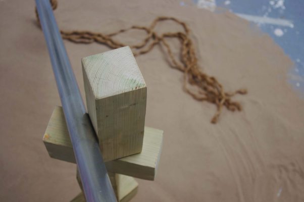 During the project I visited Portland in Dorset, where I encountered mechanical remnants of the quarrying industry. These were worn and rusted and sometimes fused together, forming sculptural compositions that no longer had functionality, and to me seemed very temporal in the way they delicately supported each other. I was interested in how temporality might be revealed in more industrial materials, and so my final work is an exploration of this – through a seemingly precarious composition of sturdier components such as wood, rope, metal, brick and glass, juxtaposed with sand and wax, which are more ephemeral. I wanted the composition to evoke a sense of anticipation and subvert the materials’ preconceived strength or original purpose, in an effort to question what can be defined as temporal and whether this is dependent on context or situation.