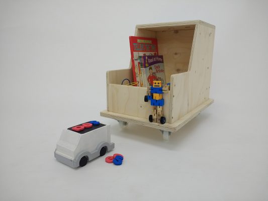 This toy vehicle is developed to stimulate the educational needs of deaf children aged between 6 and 11. This multi-functional product includes a vehicle-shaped bookcase which incorporates a small portable ramp, accompanying flip cars and two toy vans which contain a set of magnetic letters. The structure is made from hand-sanded plywood and assembled through simple screw fasteners. Some elements have been painted with acrylic and water-based paint, whereas the bookcase and car ramp have been kept plain to maintain a natural effect. This simple and versatile design is proposed for use at Frank Barnes School for Deaf Children – just around the corner from Central Saint Martins’ King’s Cross campus.