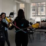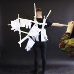 Inspired by Chindōgu, the Japanese art of creating ingenious yet absurd gadgets to solve everyday problems, this workshop challenged students to design and develop their own useful/useless problem solving objects. After an introduction to the concept from the workshop’s leaders, Shepherd Manyika (BA Fine Art alum), James Winston (BA Product Design alum) and Stephanie Buttle (BA Ceramic Design alum), students worked in teams, developing ideas in the morning and then creating the product using materials sourced from the local Pound Shop in the afternoon. Really putting the notion of Chindōgu into practice, students’ designs included a balloon personal space protector, a biscuit-dunking contraption, built to prevent that bottom of the mug biscuit build-up, and a multiple person hand-shaker/greeter.