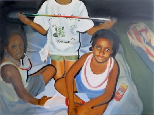 To some extent. The rest of my practice derives from similar family photo-based imagery, but I typically paint in a more realistic style. With Dinner, I reduced the figures to simple forms. I wanted to challenge myself by maintaining a minimal aesthetic; I’m usually obsessed with detail. This work also pushed me to work with a new material – wallpaper. I’m grateful for the auction because it gave me a chance to experiment and to see how the public responded to my latest work.
