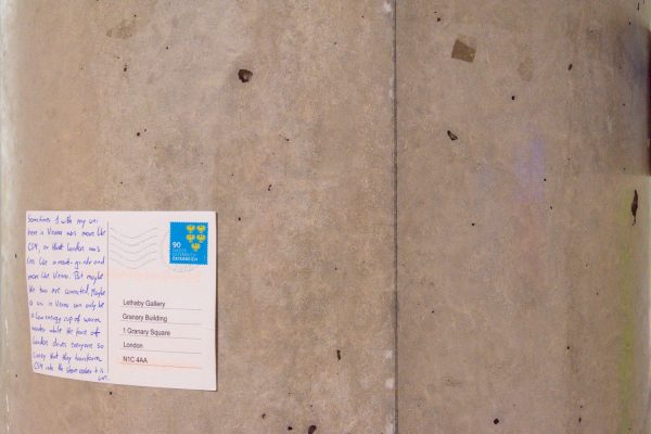 ST: Yeah and a similar work that’s less automatic is Hannah Smythes’ work where she asks Central Saint Martins alumni and Diploma in Professional Studies students who are away from the College but still have a close relationship to it, to send postcards to the Lethaby Gallery. She asks them how they feel about the institution and so this work talks about this exchange between the bodies and the structure, which is also similar to Moza’s work – the email exchange regarding her palm tree.
