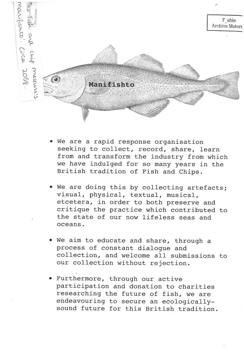The year is 2058. The fish and chip industry has crumbled due to the global absence of its most vital ingredient: fish. The world’s sea life has been persecuted into oblivion. Now only plastic floats along the ocean floor, red frills and blue bottle tops impersonating the marine lives they have displaced. Unaware, the owner of Roman Road’s Fish Bar continues to ring round her suppliers, becoming increasingly alarmed to hear that none of them have any fish. Putting down the phone after her seventh attempt, the voice of the radio and the news it brings suddenly filters into her consciousness: the day has come, the fish are gone. Aware of her own contribution to this ecological disaster, she begins to plan. Her business must adapt – it must remember, critique, reimagine…but remain.