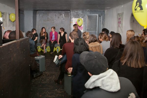 Panel Discussion at vFd’s Outsiders Gallery, Left to Right: Roma Havers (artist), Avril Bown (co-curator), Chaz Howkins (artist), Bea Redweik (co-curator), Nathalie Khan (tutor, chairing the panel), 2018. Photo: Glenn Michael Harper