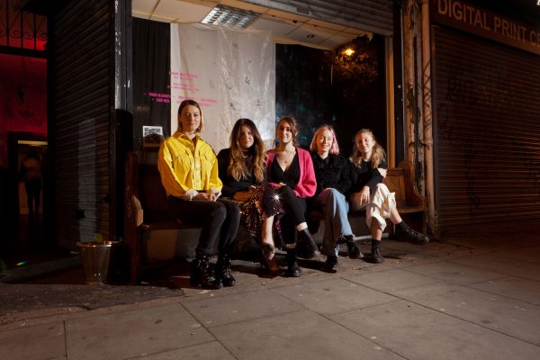Left to right: Co-curators Rhiannon Edwards, Avril Bown, Bea Redweik, Rosa Droogers and Mia Cormack in front of vFd’s Outsiders Gallery, 2018. Photo: Glenn Michael Harper