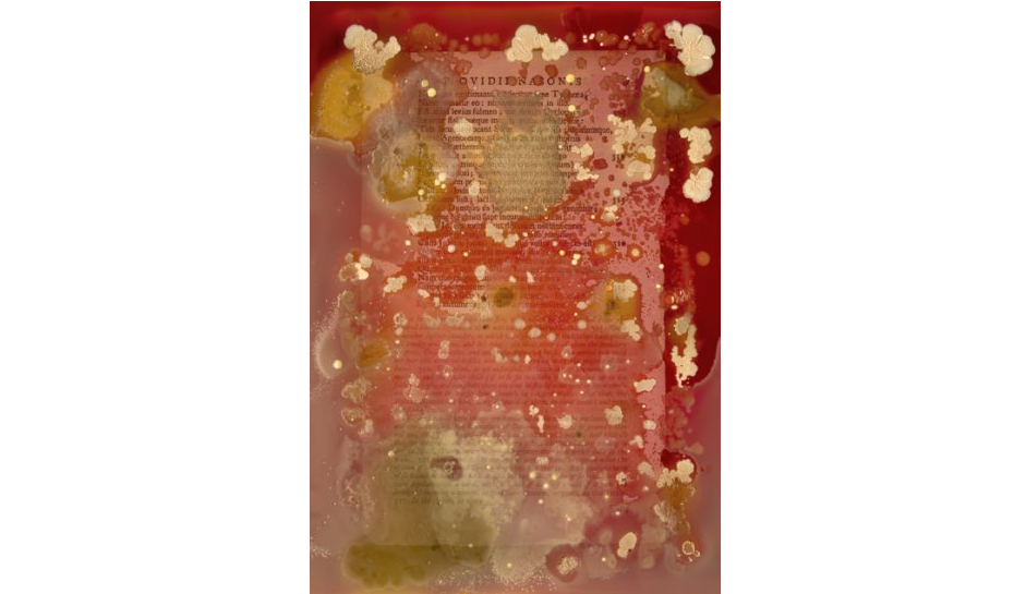With libraries digitising their manuscripts and books enabling global audiences to access them, Craske wondered about the impact on the physical artefact. As objects, do they have other systems of knowledge to offer rather than just the text on the pages? Focusing on the micro, Craske went looking for the biological information hidden in an 18th century copy of Ovid’s Metamorphoses. Her degree show work included the cultures of the bacteria as well as magnified ‘maps’ revealing the microbiology discovered across the pages of the book.