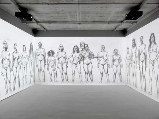 Thanks so much. Mutumia is an interactive installation that was first commissioned by the Centre d’Art Contemporain in Geneva for the Biennial of Moving Images 2016. It’s a six-screen looped animation of an “army” of hand-drawn naked women, which is projected large onto all the walls of the gallery space. It’s a salute to women who have used their bodies in protest when they haven’t been permitted to use their voices.