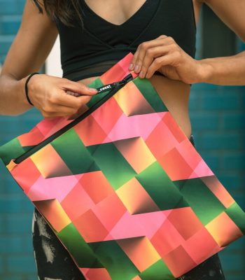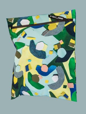 The resulting Project_Sweat kit bags are designed to fully enclose damp swimsuits or sweaty activewear. They are composed of a three-layer bonded fabric with no breathability, ensuring any moisture stays inside the bag, while the welded seams prevent any leakages. With a water-resistant finish, any water that comes into contact with the bag’s surface is also repelled. The various, graphic bag motifs have been designed by two Central Saint Martins BA Textile Design graduates, Anna Schlimm and Georgia Fleck. Contributing to the company’s strong visual direction, Schlimm was also commissioned to produce the brand logo. For our graduates, this project not only showcases their design skills, it also gives them a direct opportunity to engage with the possibilities of the product market. In a unique, employee-ownership framework, they are also able to retain an enduring part in something they helped created, as on top of their sale royalties, they have been given shares in the company.
