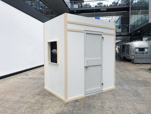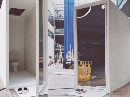 Nearby in The Street, 3D BA Fine Art student Yangbo Liu has constructed a toilet cubicle. The door to Liu’s toilet is made up of a one-way mirror, allowing the visitor inside to see those outside. Behind the cubicle, another empty toilet bowl offers a pile of oranges for the taking. Liu’s structure is a monument to the importance of personal privacy, illustrating his own definition of “comfort”. As he explains, “In traditional Chinese families, no one actually has that much personal space. We value the sense of responsibility and collectivism, so it is difficult for us to have a distinct, individual self in daily life.” For him, the bathroom became a sanctuary of private space – it is, traditionally, the space we inhabit without the company of others. Initially full of Liu’s personal belongings including books, plants and framed pictures, he decided to remove all items, leaving an empty, clinical space which references the solitary refuge of this domestic space. Interested in the relationships between spatial structures and human beings, Liu’s work is an exploration into the possibility of personal, private space in a public area.