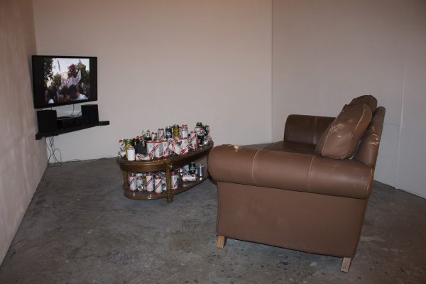 4D BA Fine Art student Lenny Watson’s installation Trouble in Clubland also relies on the domestic symbolism of the sofa, although here it is surrounded by the chaos of empty beer cans and cigarette ends. Watson’s sofa is upholstered in a battered, scratched leather; the walls are stark and white, the floor is bare and uncovered; the large TV is the focal point of the room setup, with a substantial sound-system. In the last decade, nearly 40% of live music venues have closed, meaning nightlife culture is increasingly relocated to small-scale and domestic environments. Using motifs and objects which are reminiscent of contemporary nightlife, Watson’s Degree Show work addresses the implications of a decline in live music venues on music culture more broadly.
