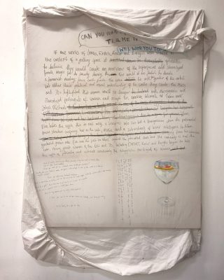 As a painter, Sophie Castle explores intimacy in relationships, often depicting mundane, everyday actions. Repeatedly painting herself and her boyfriend naked, she uses the historical motif of the nude to counter and empower a body-obsessed generation. Alongside Castle’s large-scale figurative paintings, one canvas is filled with her handwritten notes, denouncing female stereotypes and the role of the “subordinate” muse. Large portions and single words are scratched out, as though it has been edited, refusing a straight forward reading of the narrative. Gradually, the writing becomes smaller, until it is unreadable at the bottom of the canvas, veering diagonally and vertically. Castle’s canvas here is in fact a used bed sheet, constructed so it drapes over the front corners, obscuring a question that Castle has begun, ‘Can you read’.