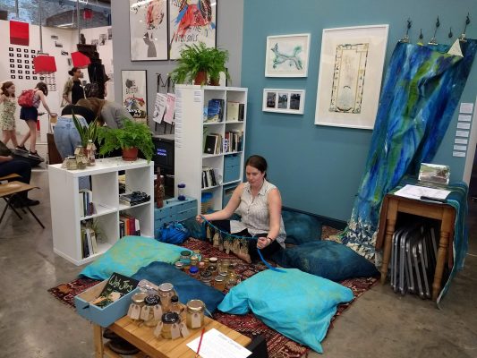 The appropriation of the “domestic” continues throughout Show One, with 3D BA Fine Art student Tom Bull using supermarket mushroom trays, tea towels and a drying rack in his small-scale sculptural assemblages, and MA Art and Science students Liv Bargman and Rebecca Leach McDonald creating room installations. Bargman’s Office for Good Measure is a fictional, governmental office with wooden furniture and promotional material, while next door, McDonald’s is an inside-out domestic space, full of floor cushions, rugs and tie-dye tapestries, which charts the changing relationship between humans and the environments they live in, themed around the mythology of the Valley of the River Fleet. MA Fine Art student Sofia Bonato incorporates daily cosmetics such as toothpaste and hair-dye into her multi-faceted practice, drawing parallels between our levels of consumption and environmental damage. Across Show One, the use of the domestic ranges from everyday, mundane materials to the recreation of full immersive habitats. Whether recreating pre-existing rooms, or creating fabricated ones, these works dissolve the boundary between an exhibition setting and a personal one. Taking materials directly from familiar surroundings, these students are presenting both a personal and universal environment for us to inhabit.