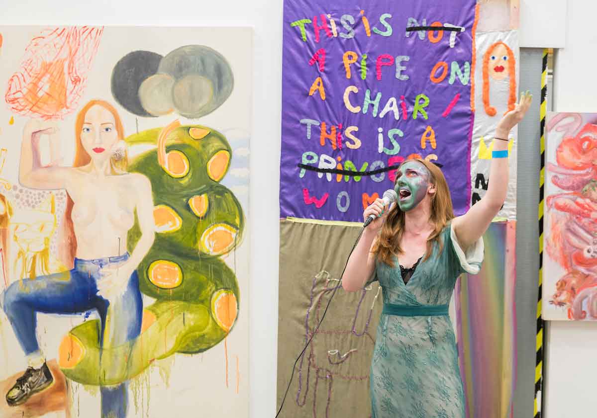 Another BA Fine Art student remaking the history of painting is Hayley Jane Chapman. Combining painting with performance, Chapman takes motifs from the work of famous male artists and turns them inside out to present a feminist vision in front of which she performs humorous, barbed spoken word work as her alter ego Frogwoman.