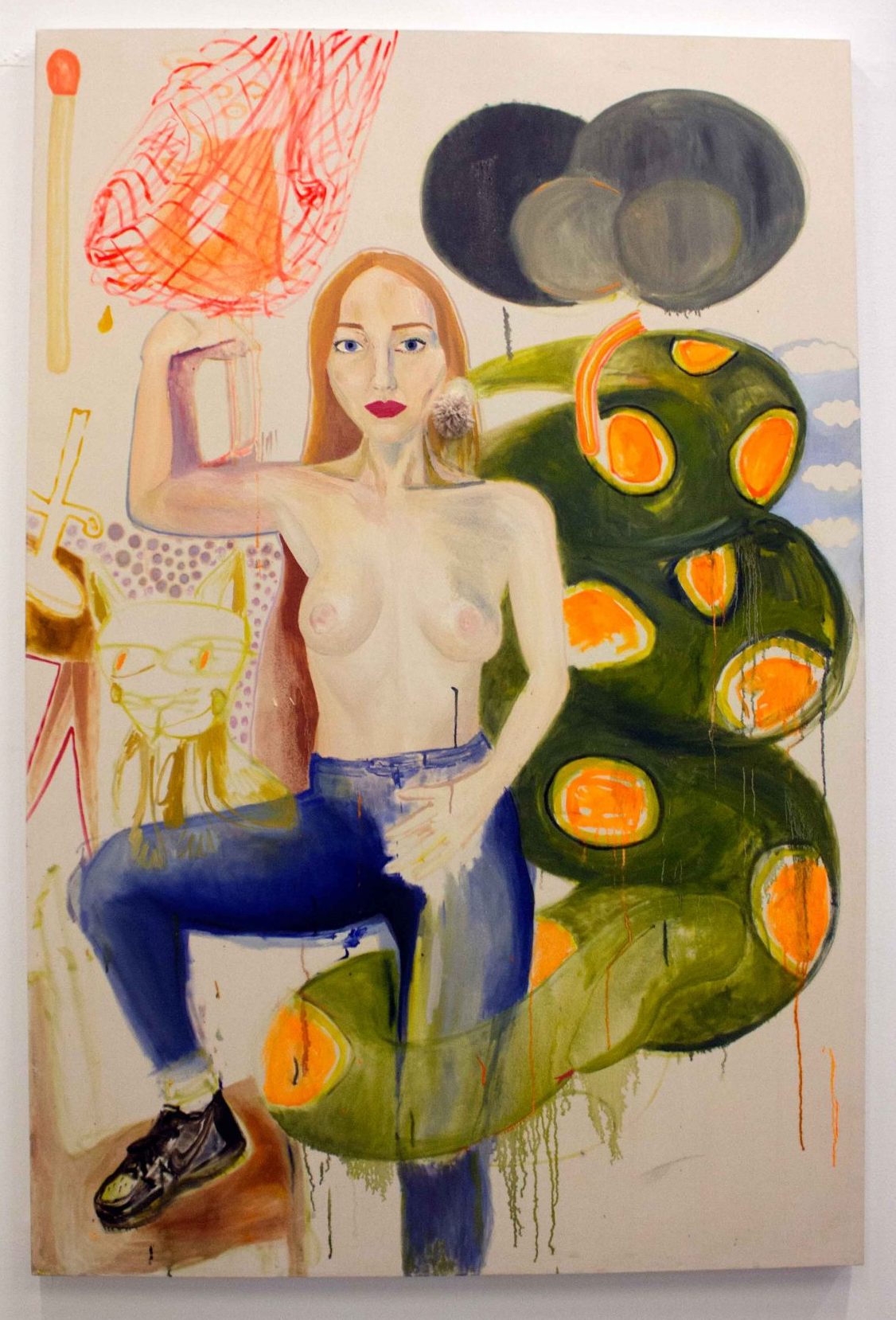 Chapman’s works undoubtedly make political statements but, at the same time, they are laced with humour. In one painting, appropriating a pose from John Currin, she stands topless and defiant, tensing her bicep with a gigantic serpent from the Garden of Eden. In another, she introduces the language of domestic craft, embroidering Van Gogh’s chair in sequins and Magritte’s Ceci N’est Pas Une Pipe with the phrase “This Is Not A Pipe This Is A Princess Woman”.