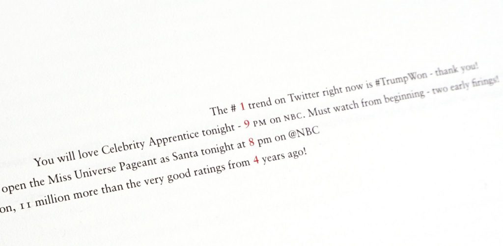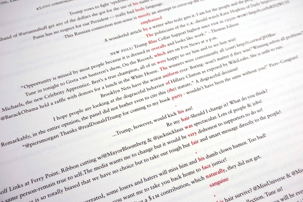 The result is a scroll of tweets with one word of each highlighted in red, allowing the first chapter of 1984 to be read vertically. It’s a clash in one object, between the permanence of traditional publishing and the transience of digital communications, and, in an extension of that, the disparity between an enduring truth and a malleable one. Set exquisitely in Sabon typeface, the project not only cements Trump’s tweets, but also highlights the triviality and hypocrisy of his statements. “He’s tweeted all of these words, but I’m simply taking them out of context, which is exactly what he does. I’m using his own words to hang him with,” says King.