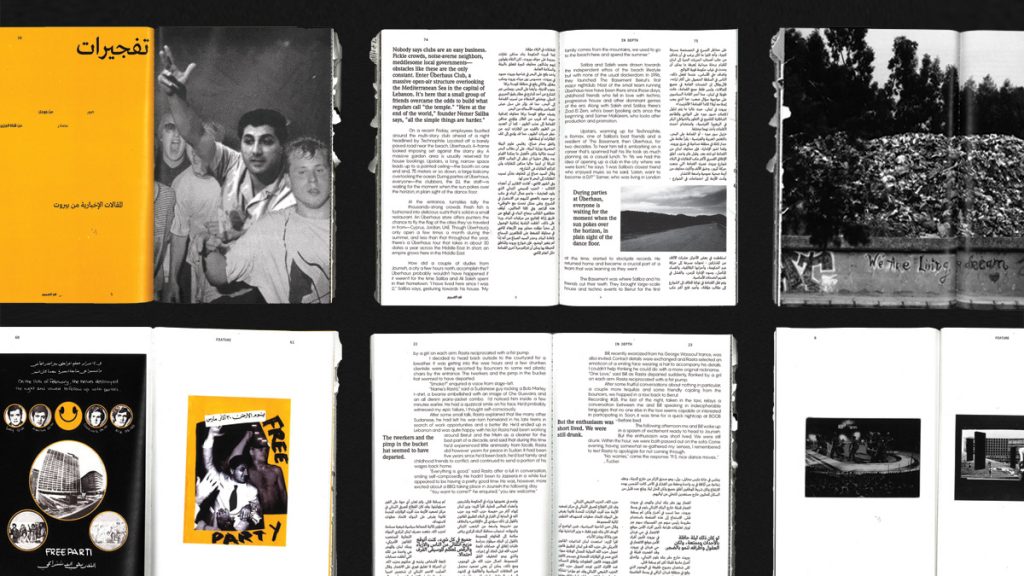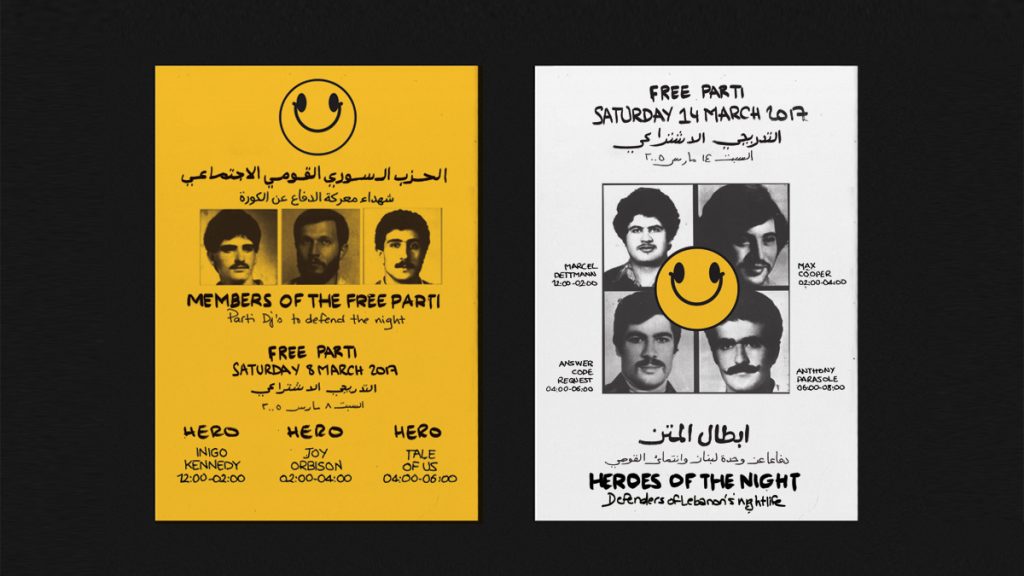 The result is her Free Parti movement, a magazine, record and poster series that places the nightlife culture in direct contrast with the ongoing instability and violence. A techno track is formed from the abstracted sounds of bomb blasts, a poster type more usually showing “martyred heroes” which in Aoun’s hands presents DJs as the “Heroes of the Night”. The enforced collision of the reality and the fiction comes into most sharp focus in the magazine.
