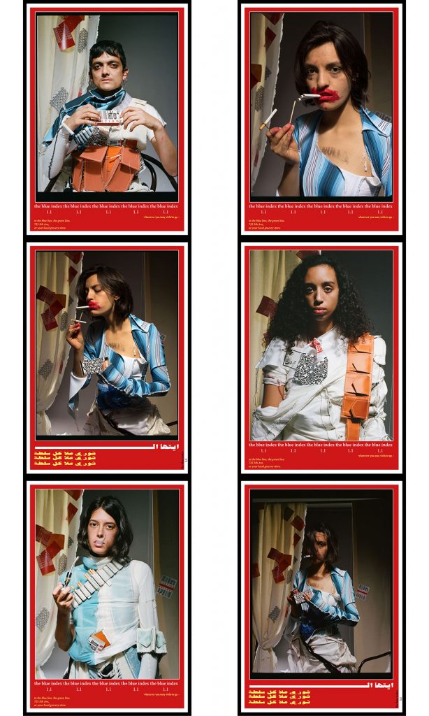 Akiki’s underground movement doesn’t stop at garments, there are badges, stamps, posters, matchboxes, a website and more. She has created her own propaganda machine inspired both by her thoughts on life in Lebanon but also by the fashion system. Slogans include “no to perception management” and “no to the oversimplified jpeg”. Recruits may start with a poster but end up fully-kitted out in Blue Index 1.1 where the military and mundane combine to create an invisible army without nationality.