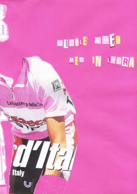 Some of my prints use text to explore the social issues surrounding cycling – often in a light-hearted and comedic way. I incorporate common phrases, such as “middle aged men in lyrca” to draw attention to and subvert the social issues within the cycling community. I was originally inspired by a collection of vintage weekly cycling magazines, adopting their graphic aesthetic. The quotes describing the relationship between the worlds of men’s and women’s cycling are taken from interviews with female cyclists that I conducted. “Shrink it and pink it” defines the ethos of women’s modern cycle-wear – how it is adapted from and made in relation to menswear, rather than in accordance to women’s needs. “Testosterone fuelled pack activity” is a reference to the racing world, indicating the view that it is non-inclusive.