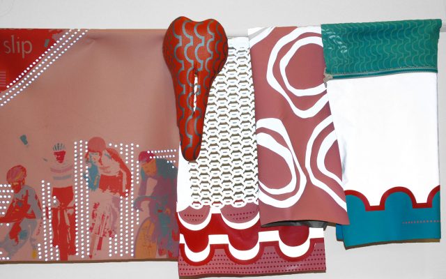 For me, it was imperative to create functional products with a high level of performance alongside the design and concept. I drew upon my research into cycle wear brands, using stretch fabrics for ease of movement, reflective elements for safety on the road and mesh panelling for breathability. Paralleling textures, shape and patterns from initial drawings of bike parts and mechanics, I used techniques such as layering and bonding. I combined sport fabrics with reflective vinyl, printed scuba fabric and lycra. By exploring the use of zips and fastenings and joining fabrics with different properties, I could produce a seamless construction. These modern material choices are combined with an illustrative style of print, textures and details in order to produce a “feminine” aesthetic. I was also inspired by The Red Hook Criterium Series by Specialized – a custom-printed collection for an elite cycling team. The collective look includes a coordinated bike, helmet, skin suit and accessories. Intrigued by their bold colourful collection, I completed my final collection with a matching screen-printed leather bike set.
