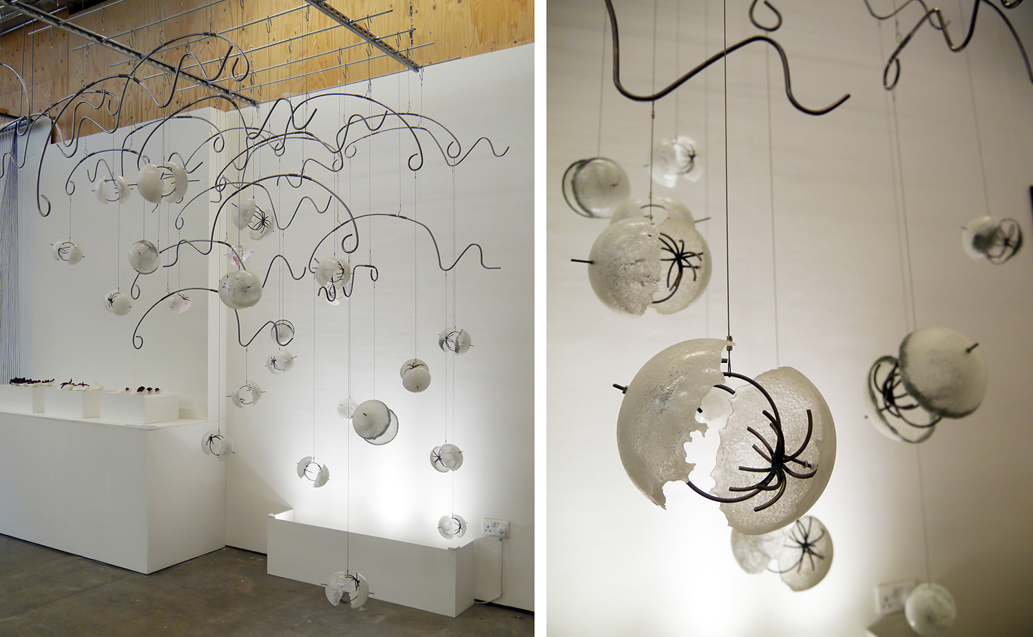 Alongside glass, the other main component of my piece Cellscape is steel. The piece mixes hand-shaped components, welded elements and off-the-shelf nuts, bolts and threaded rod. One of the defining factors of Cellscape is that it the weight of each piece is poised in physical balance, suspended from the ceiling. Nothing other than the strength and flexibility of steel would fulfil the weight-bearing requirements.