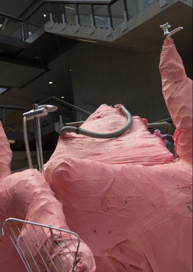 Tom Coates, BA Fine Art, has transformed the unassuming material of cling film into a bathroom come to life. A bright pink amoebic sculpture with limbs finished with faucets, toilet brushes and loo seats, his work – though playful and extraordinarily odd – houses a functioning shower (see the piece in motion). Inspired by the uncanny and camp, Coates talks about his work as “objects which have aspirations to be something more than they are, that want more than they have”.